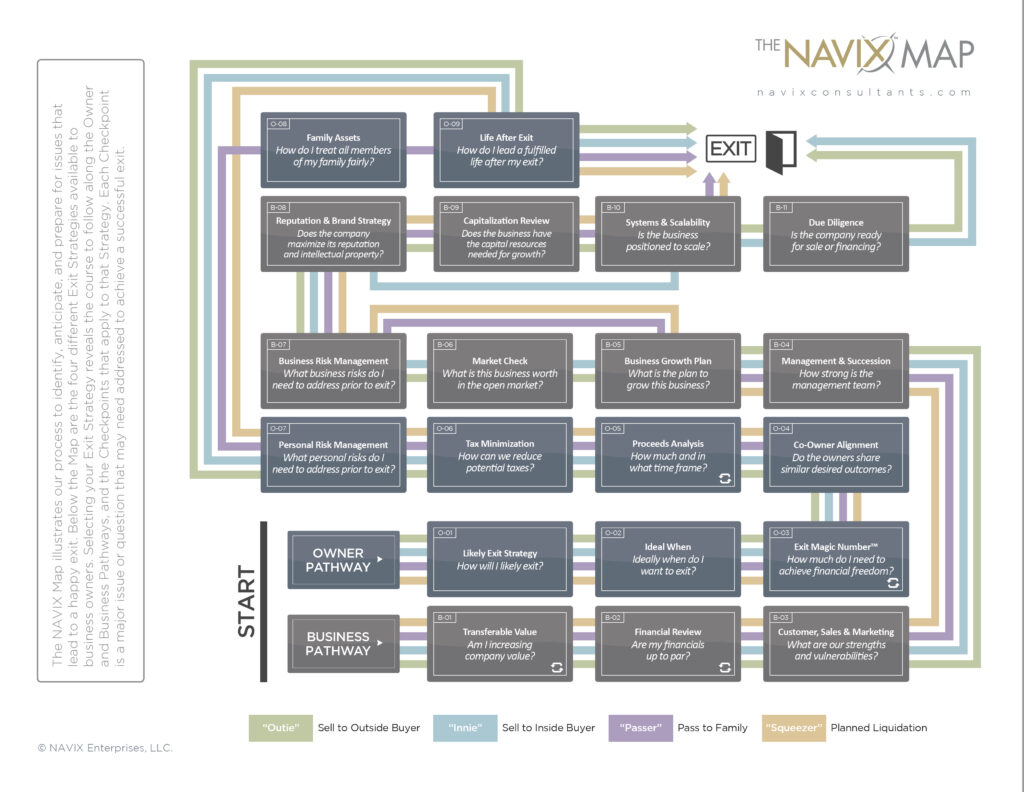 Several things about the NAVIX planning model are unique. As the NAVIX MAP below illustrates, we follow two paths simultaneously. We analyze and focus on improving the business’s attractiveness to buyers. And we focus on the person including identifying the ideal “when,” managing personal risk, defining and calculating financial freedom, taking steps to minimize the impact of taxes and exploring what comes next,